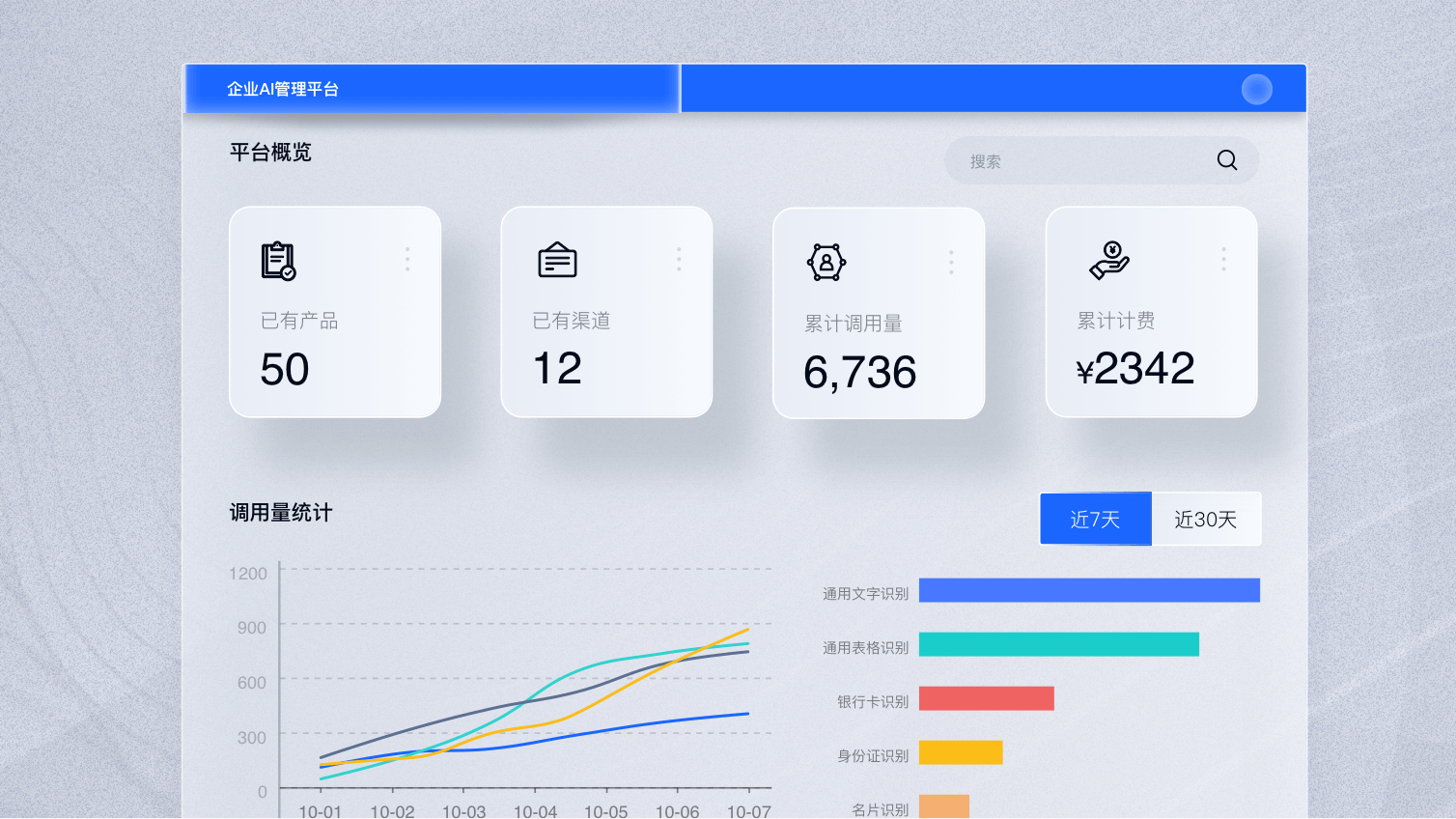 集TextIn OCR識别接入、第三方AI能力接入、API管理(lǐ)、業務分(fēn)發、數據管理(lǐ)、統計(jì)監控的一站(zhàn)式AI管理(lǐ)平台,解放(fàng)運維壓力,助力企業流程智能化改造升級